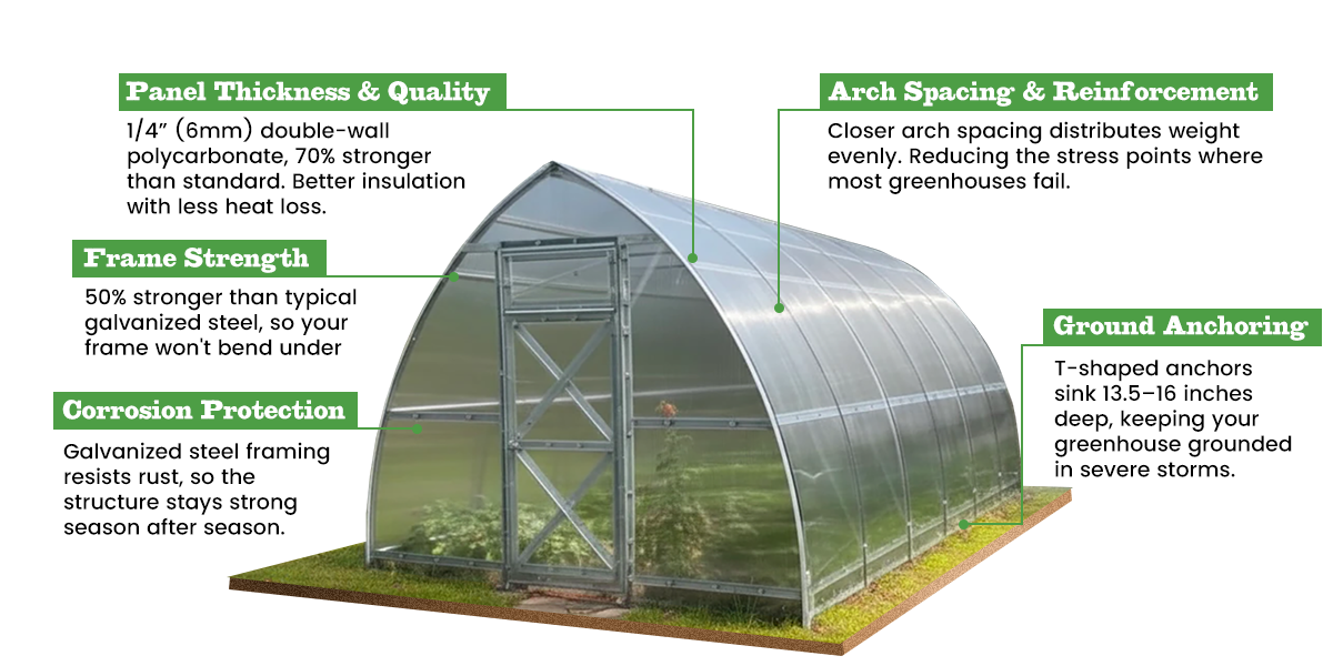 Our greenhouses handle up to 3 feet of snow (32-49 psf depending on model). The 3 1/16" galvanized steel frames are 50% stronger than typical galvanized steel, and the arched designs let snow slide off naturally.