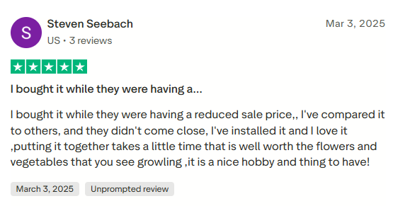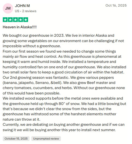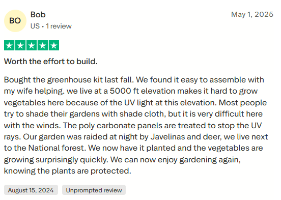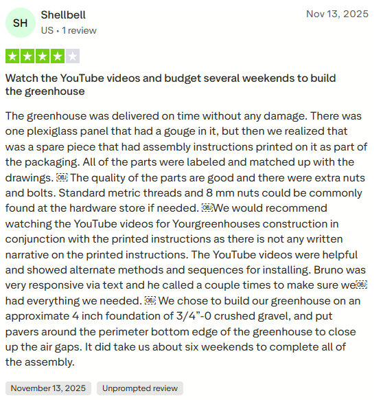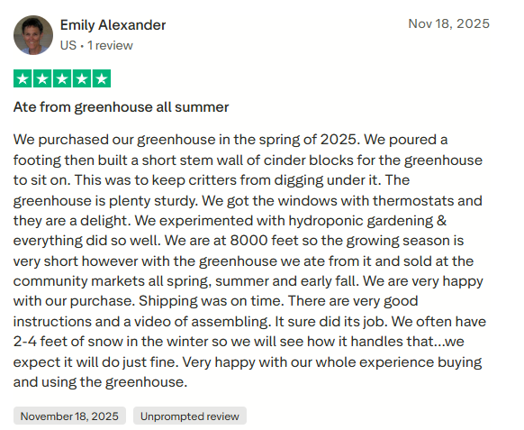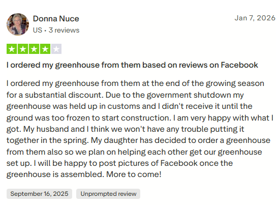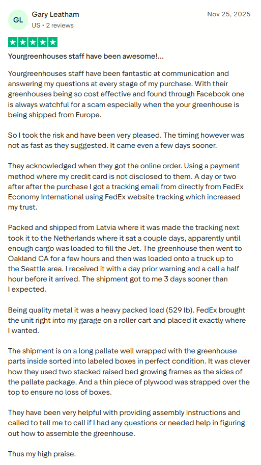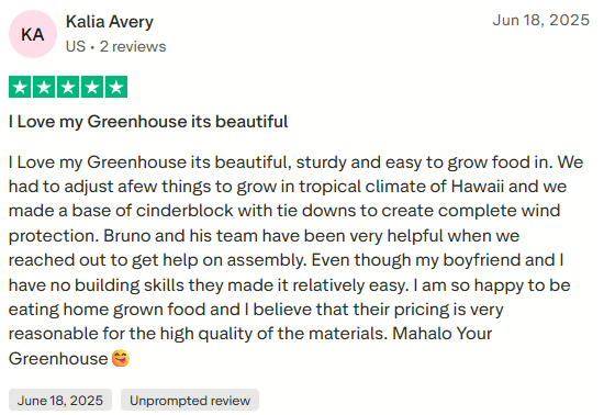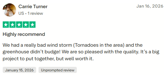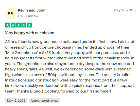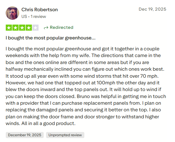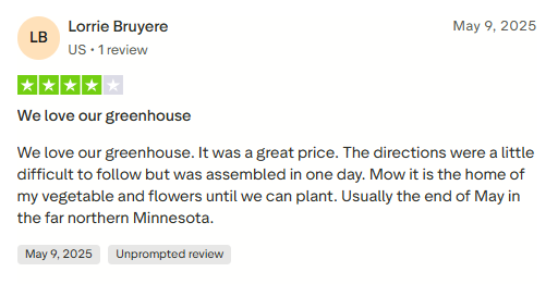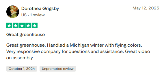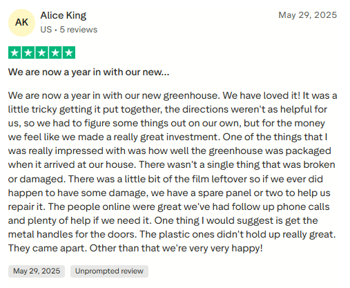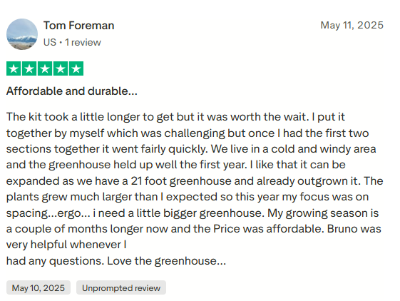 Your greenhouse is ready. Our 10-year warranty and customer support team are behind you from here.
