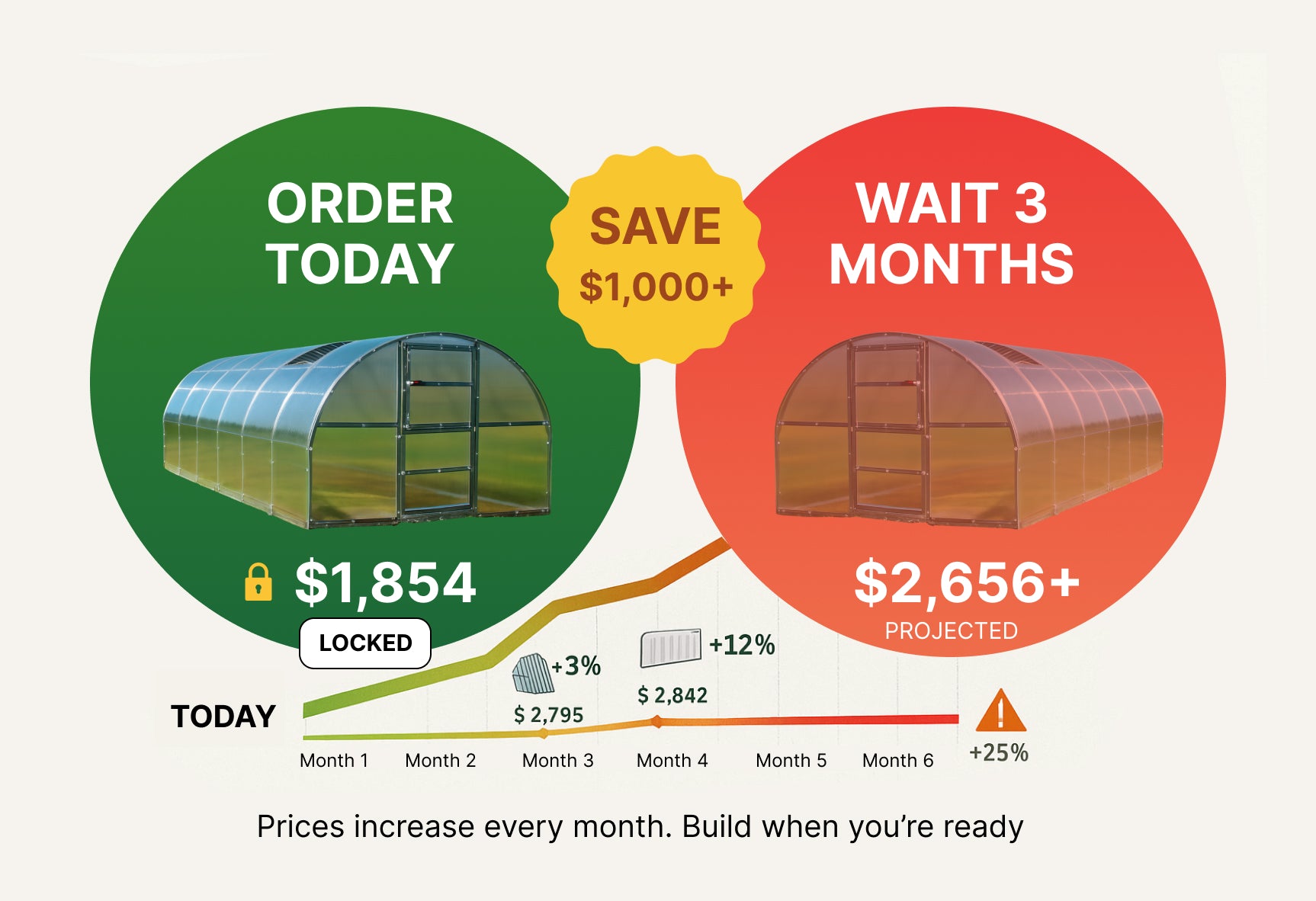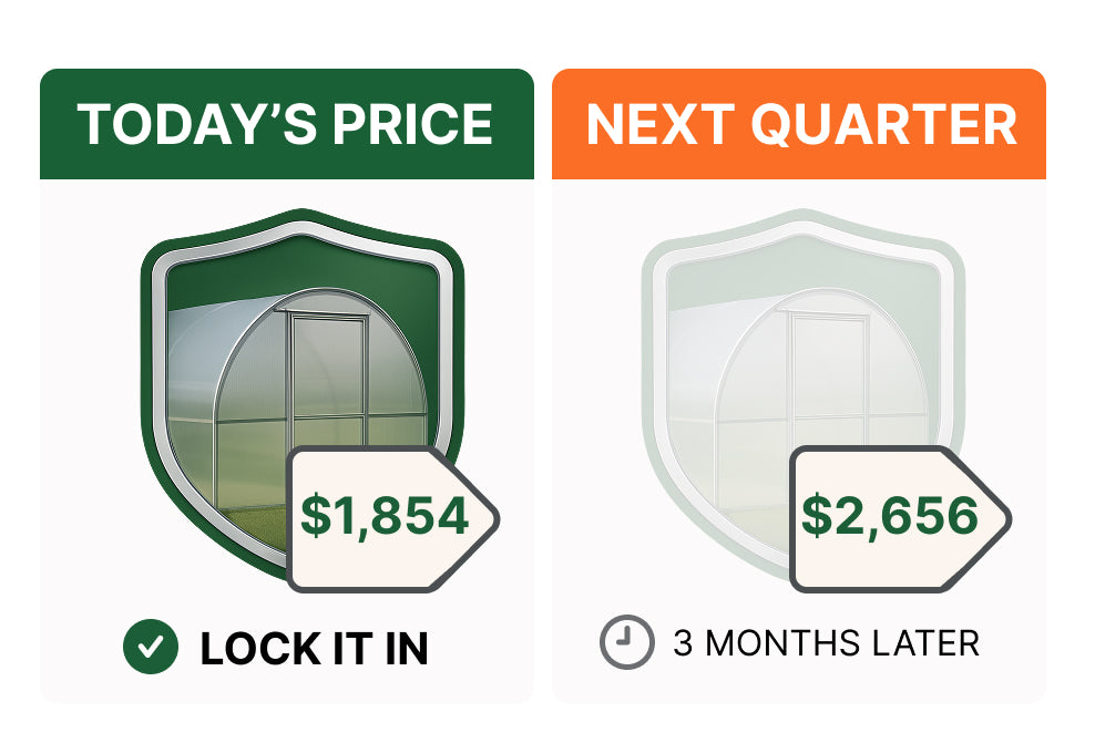 We pass those savings directly to you. You get the same high-quality greenhouse at a significantly lower price simply because you bought early.