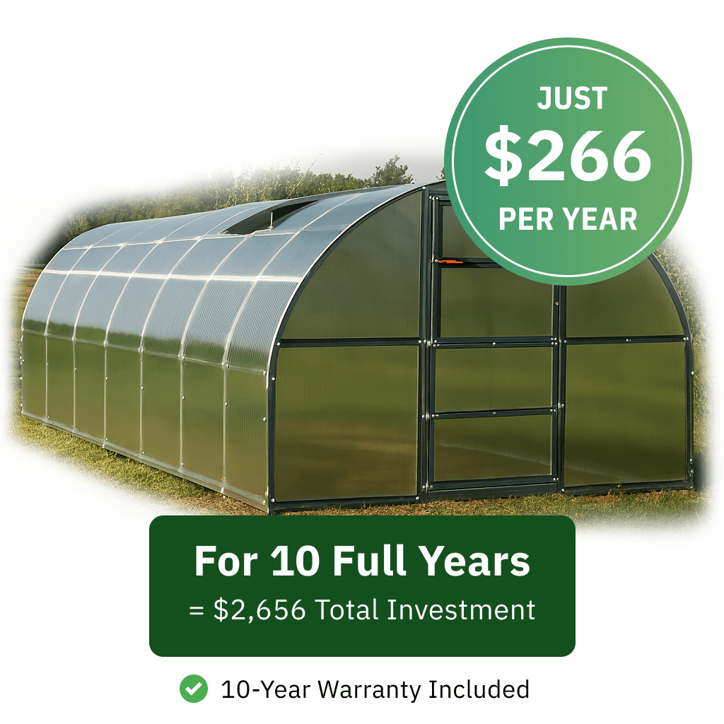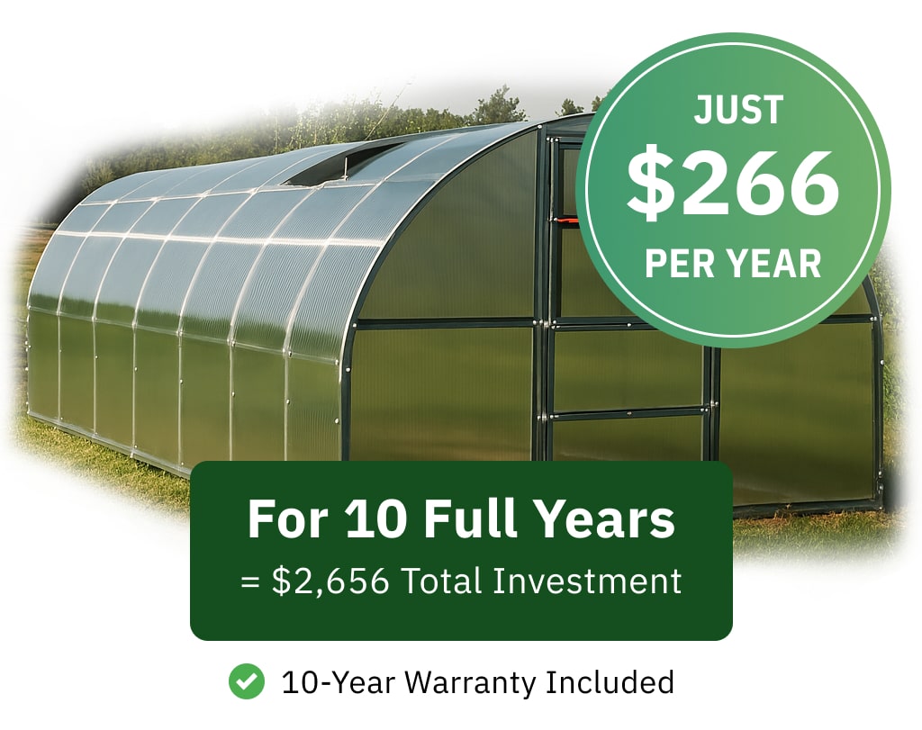 For less than your monthly grocery bill, you get a decade of worry-free growing. Our 10-year frame warranty (plus 5-year panel coverage) means you're investing just $266 annually in professional gardening.